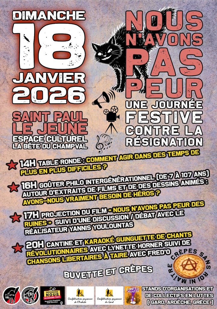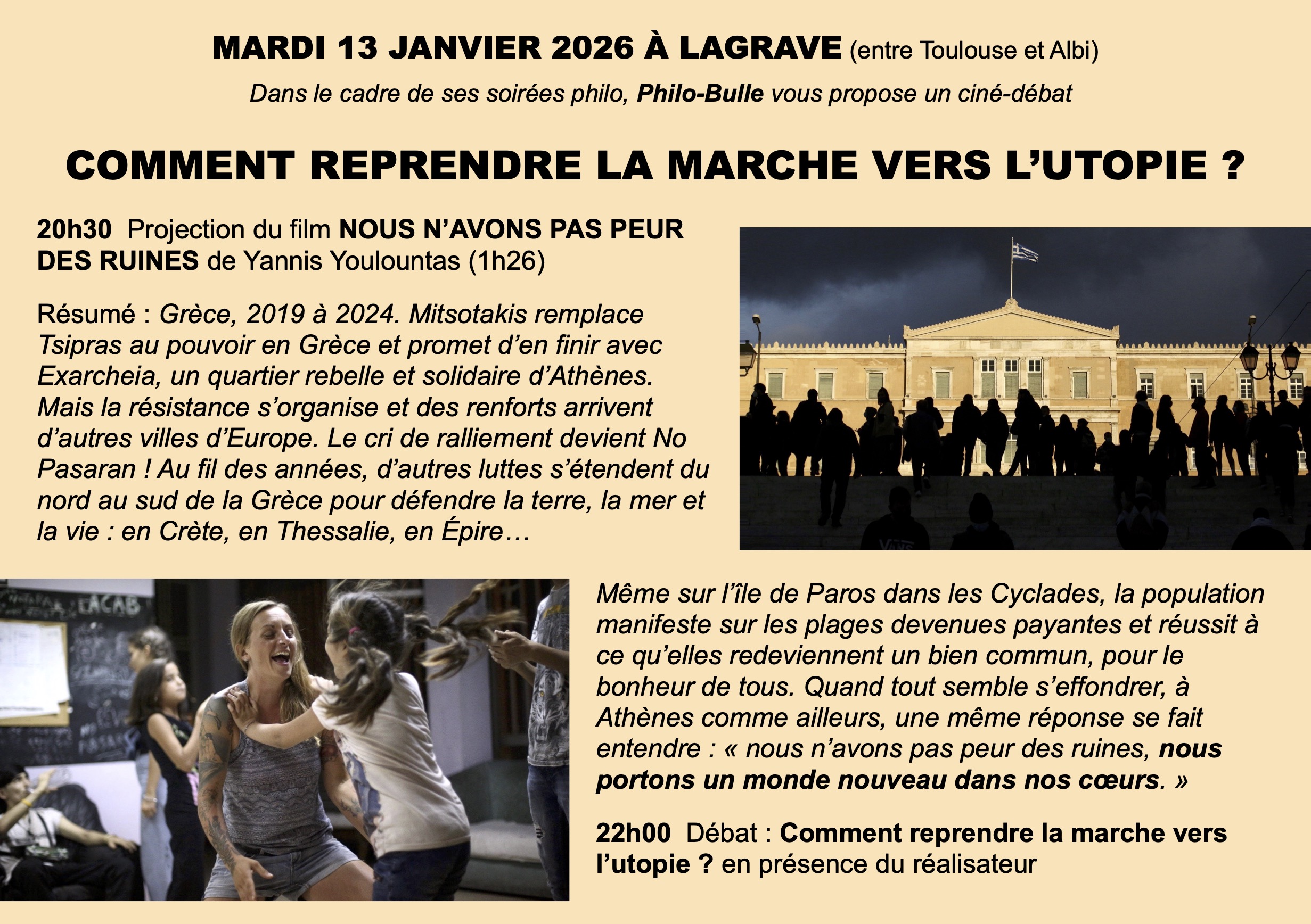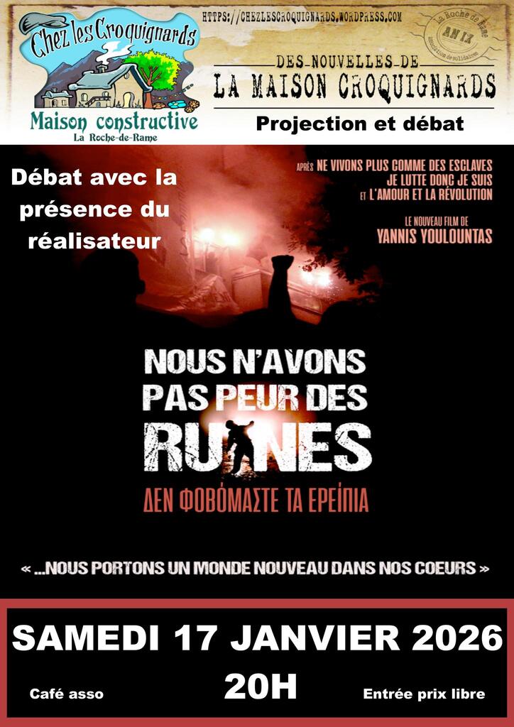 17h00 : projection du film Nous n’avons pas peur des ruines puis discussion avec le réalisateur, actualité des luttes en Grèce et en France